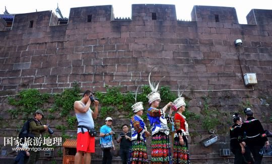 10月13日,來(lái)自湖南靖州苗族侗族自治縣的展演隊(duì)伍在鳳凰古城城樓上展示苗服。