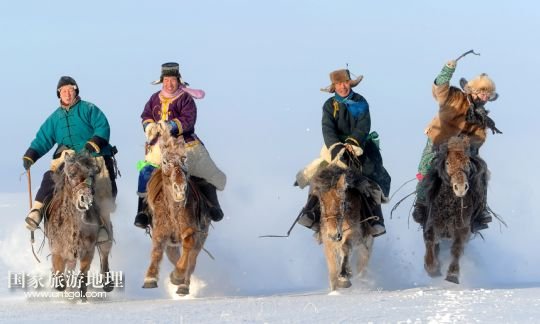 牧民在內(nèi)蒙古呼倫貝爾市新巴爾虎左旗的冬季賽馬會(huì)上策馬揚(yáng)鞭(2011年1月1日攝)。
