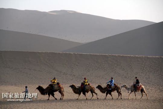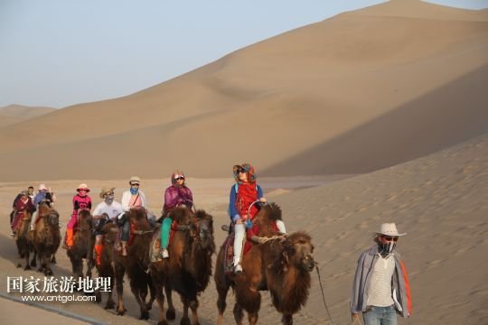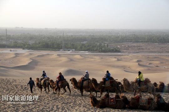 5月18日,游客乘駱駝在甘肅省敦煌市鳴沙山月牙泉景區(qū)欣賞大漠風光。
