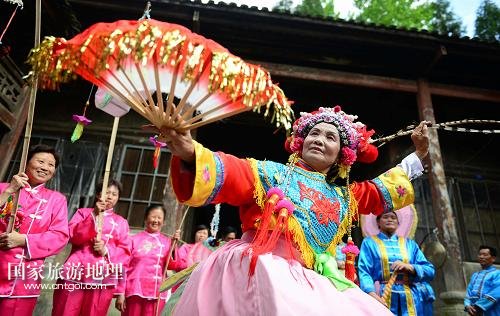 國(guó)家旅游地理 湖北恩施5月28日訊 5月27日,湖北省利川市柏楊壩鎮(zhèn)柏壩楊村的民間藝人陳文菊在表演利川燈歌的代表作《龍船調(diào)》。利川燈歌起源于湖北省恩施土家族苗族自治州利川市柏楊壩鎮(zhèn)一帶,距今約300多年歷史,2011年入選第三批國(guó)家級(jí)非物質(zhì)文化遺產(chǎn)名錄。有記載稱(chēng),從清朝開(kāi)始,當(dāng)?shù)厝罕姺昴赀^(guò)節(jié)、喜慶集會(huì)、玩彩龍船時(shí)都要唱燈歌。如今,在柏楊壩鎮(zhèn),有一些熱愛(ài)民族文化的老藝人,用心口相傳的形式傳唱利川燈歌,釋放土家人豁達(dá)、幽默的人生情懷。利川燈歌具有很高的民族文化藝術(shù)價(jià)值,《龍船調(diào)》《篩子關(guān)門(mén)眼睛多》《打把扇子送情》等一批燈歌旋律優(yōu)美、歌詞詼諧生動(dòng),深受人們喜愛(ài)。新華社發(fā)(楊順丕 攝)