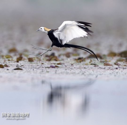 5月29日,在江西省九江市賽城湖濕地,一只水雉準(zhǔn)備在水面上降落。