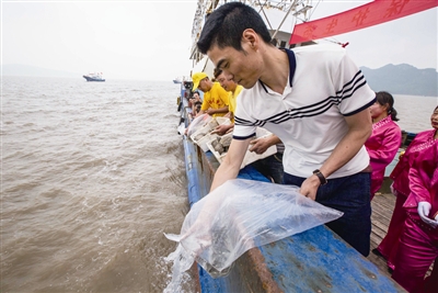 最后,浩浩蕩蕩的漁民和民俗隊伍乘坐9艘漁船,在檀頭山海域演繹休漁謝洋海上放生儀式,2000尾黃魚苗和500只海龜被放入大海。